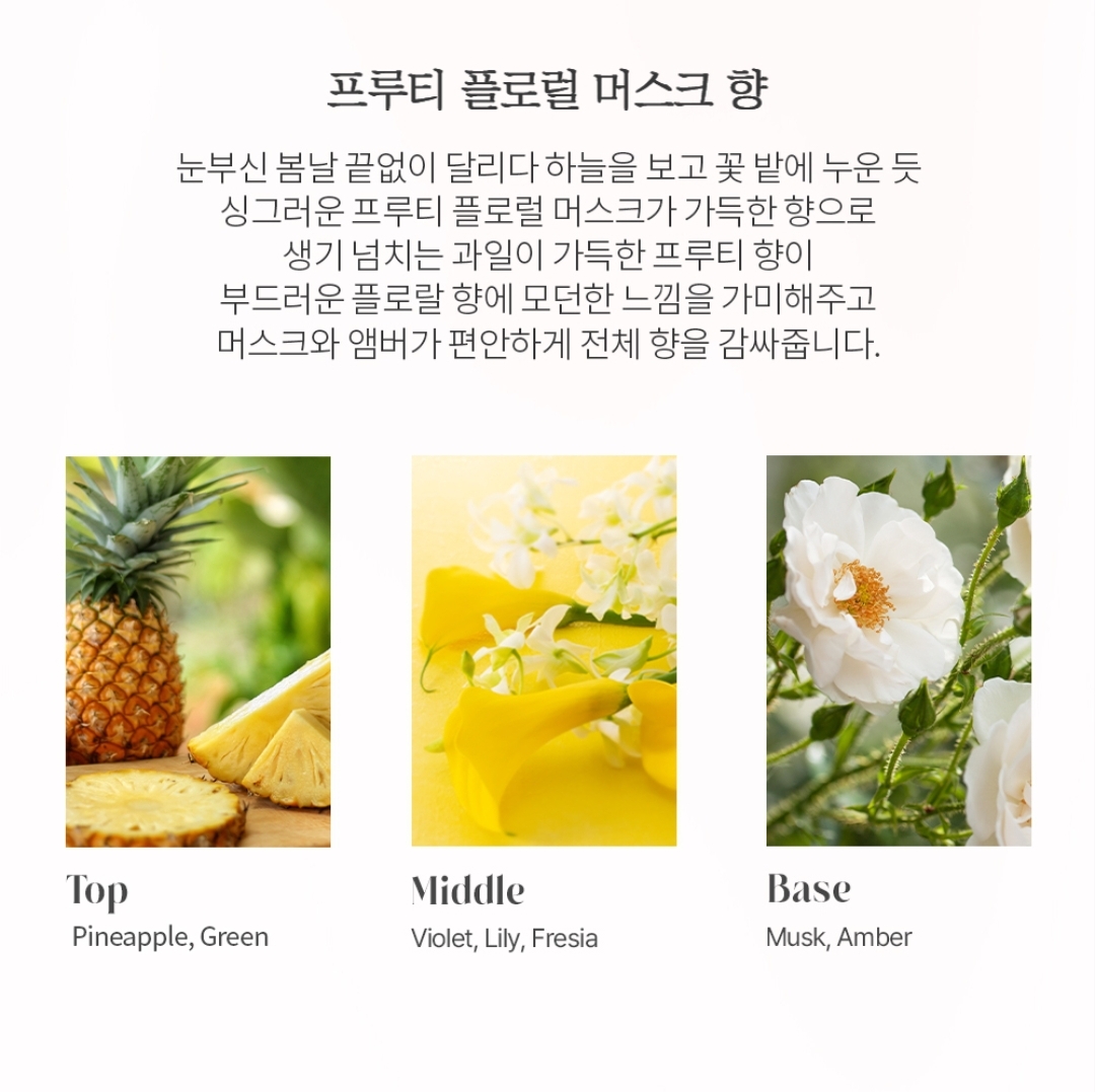 رایحهی Fruity Floral Musk: حس بهاری و شاداب، با نتهای آناناس و بنفشه، لیلی و فریزیا، و پایه مشک و عنبر برای ماندگاری طولانی
